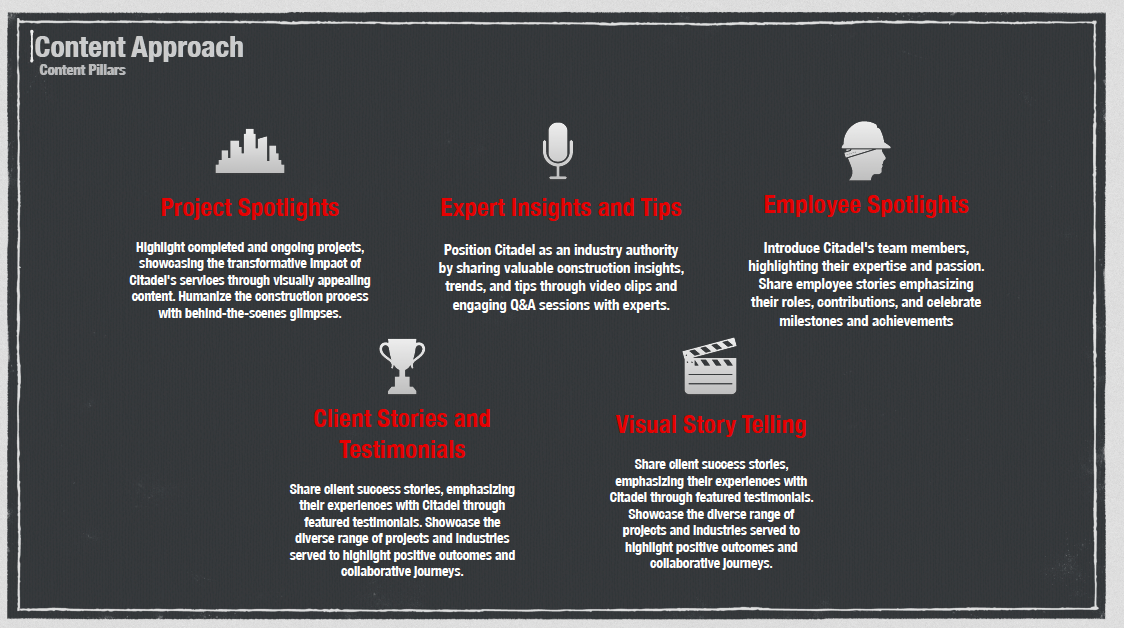 I was tasked with building a focused social media strategy to fuel email marketing and LinkedIn. specifically targeting developers, franchise owners, and prospective clients. I conducted a social media audit, defined a content plan, and produced/edited 28 project walkthrough videos that showcased Citadel’s work. The campaign elevated brand visibility and delivered an immersive, informative view of our construction and development capabilities, driving stronger awareness and qualified interest.